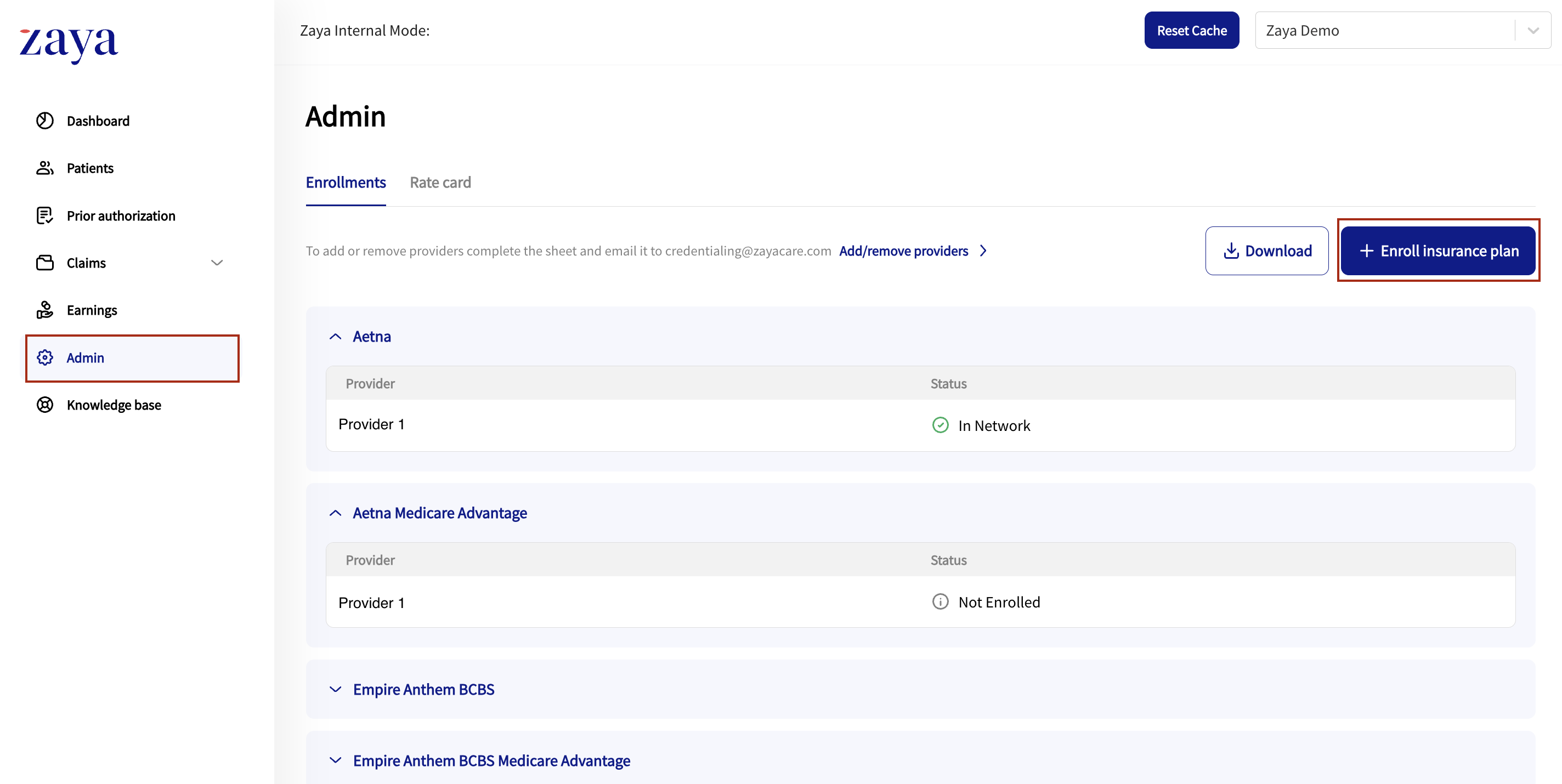 In the Zaya Portal, go to the Admin section. Each insurance is listed next to the provider with the In-Network status. This status updates live. You can bill in-network once the status shows In-network and the effective date has been reached.